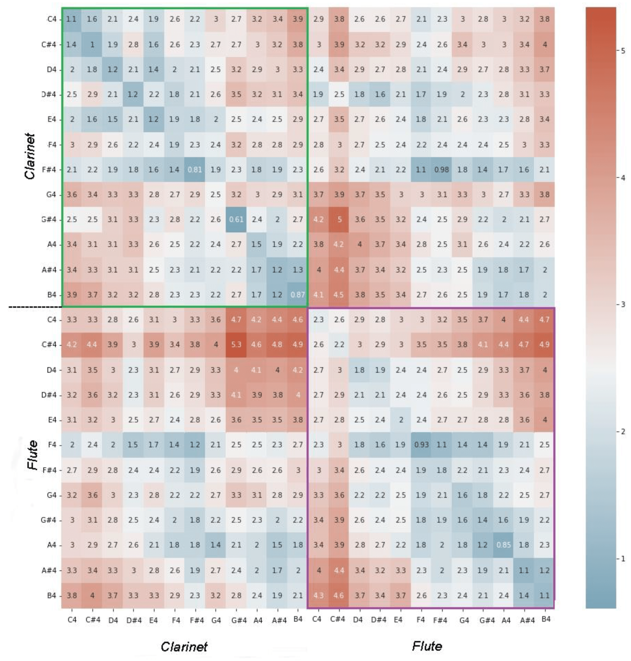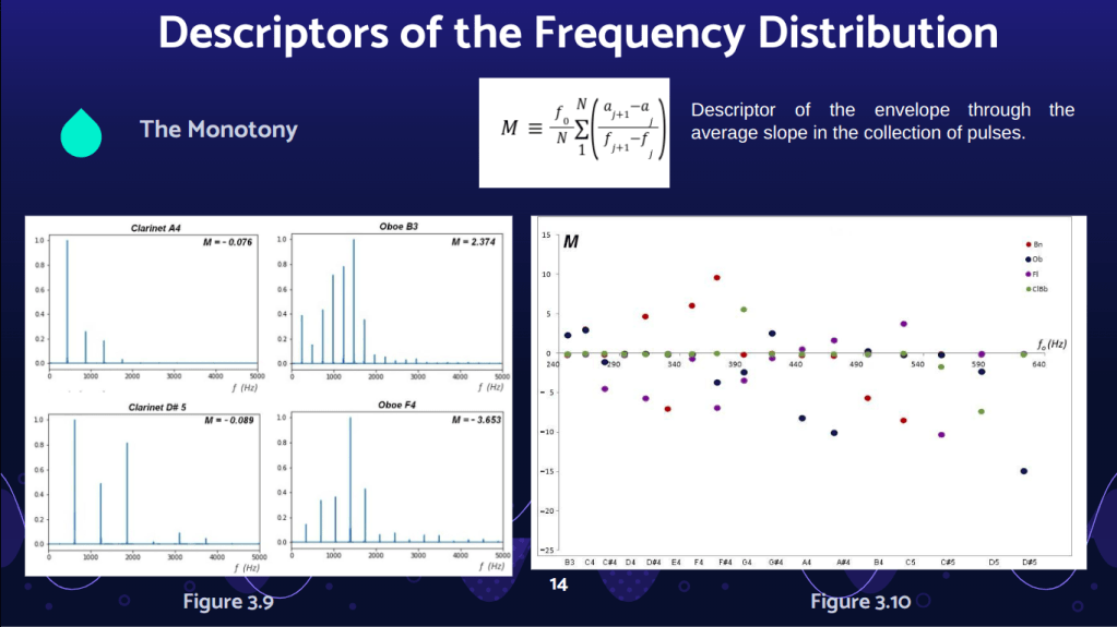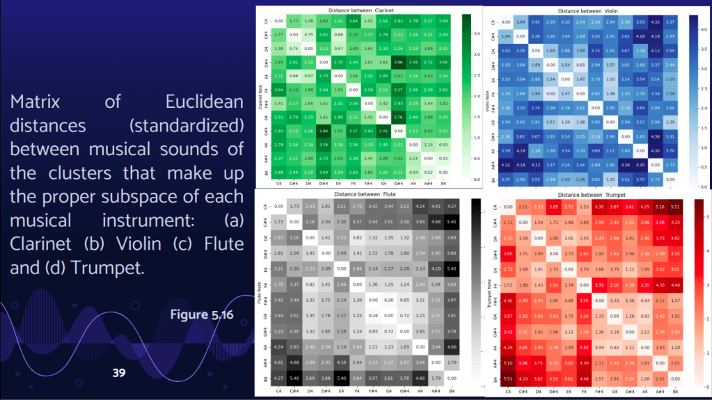 We explore an abstract space with 7 dimensions formed by the fundamental frequency and FFT-Acoustic Descriptors in 240 monophonic sounds from the Tinysol and Good-Sounds databases, corresponding to the fourth octave of the transverse flute and clarinet.
